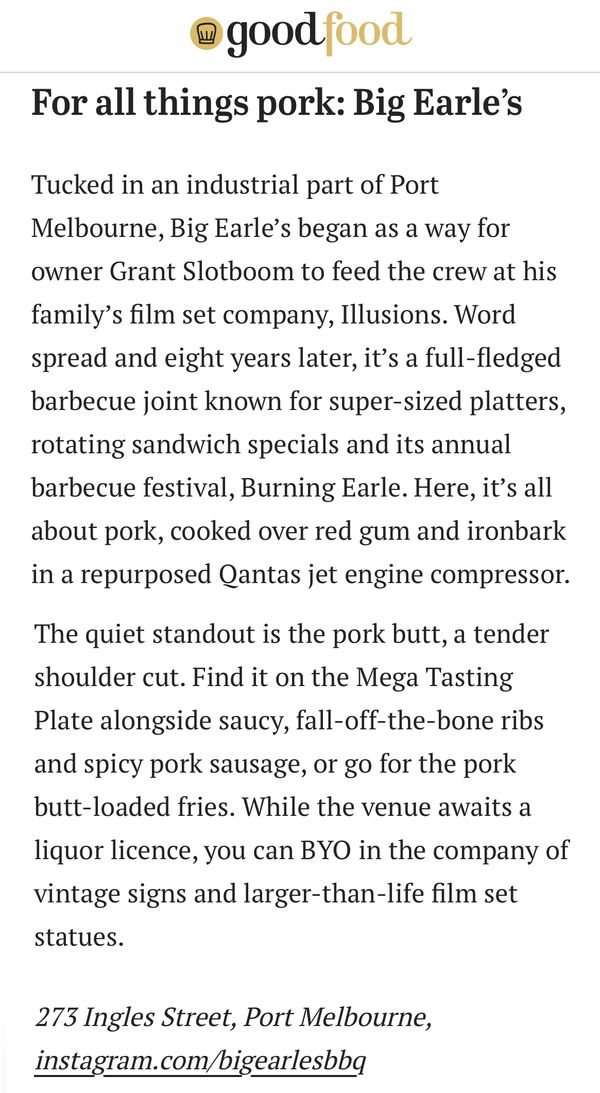 We’re thrilled to share that Big Earle’s has been featured in the Good Food Guide by The Age — one of Australia’s most prestigious culinary publications. For a humble barbecue joint that started as a way to feed the film crew from our sister company, Illusions, this recognition is a true milestone.